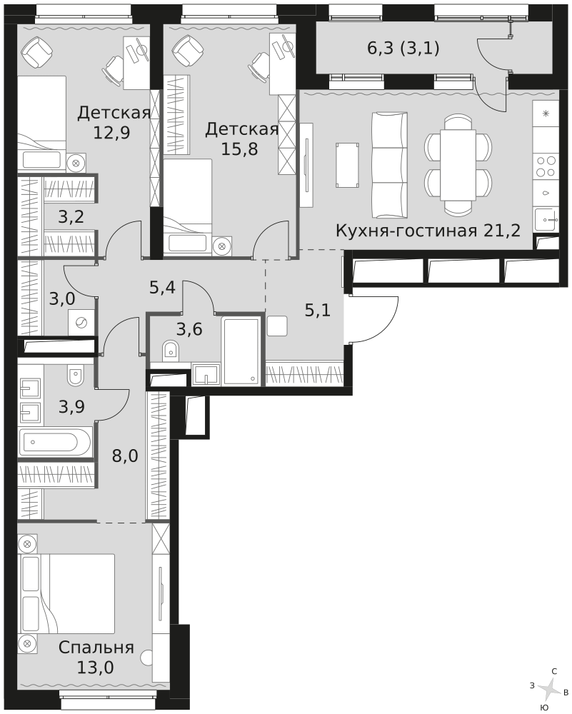 - Мастер-зона с санузлом и гардеробной. Всё для вашего комфорта и удобства, включая личный санузел и гардероб.