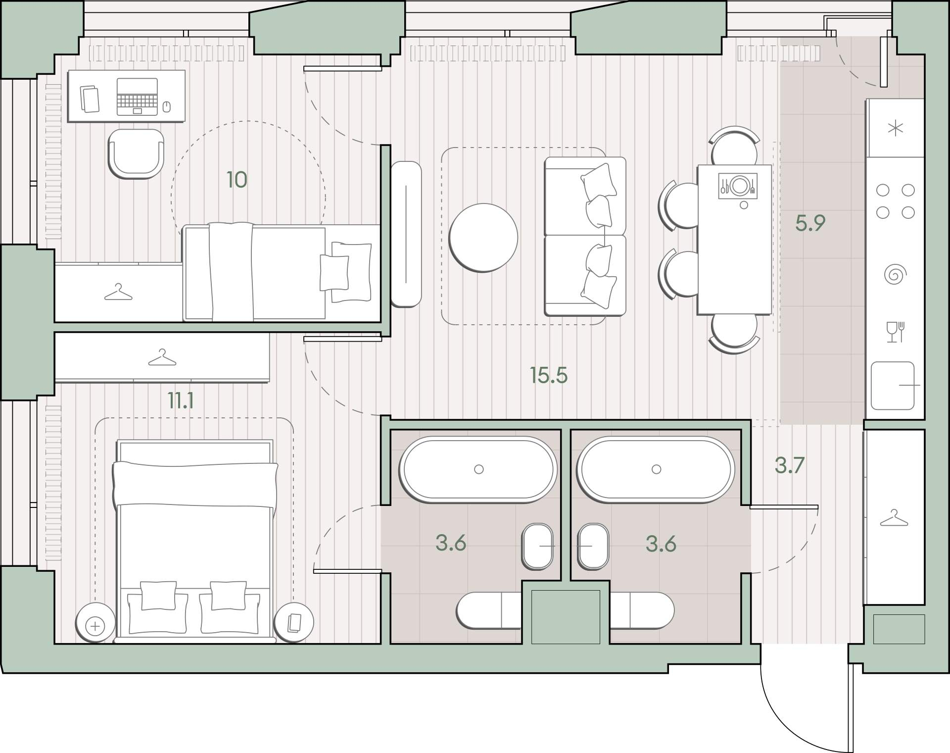 - Мастер-зона с санузлом и гардеробной. Всё для вашего комфорта и удобства, включая личный санузел и гардероб.