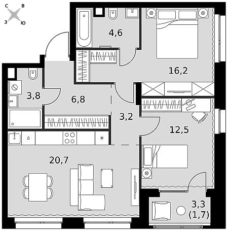 - Мастер-зона с санузлом и гардеробной. Всё для вашего комфорта и удобства, включая личный санузел и гардероб.