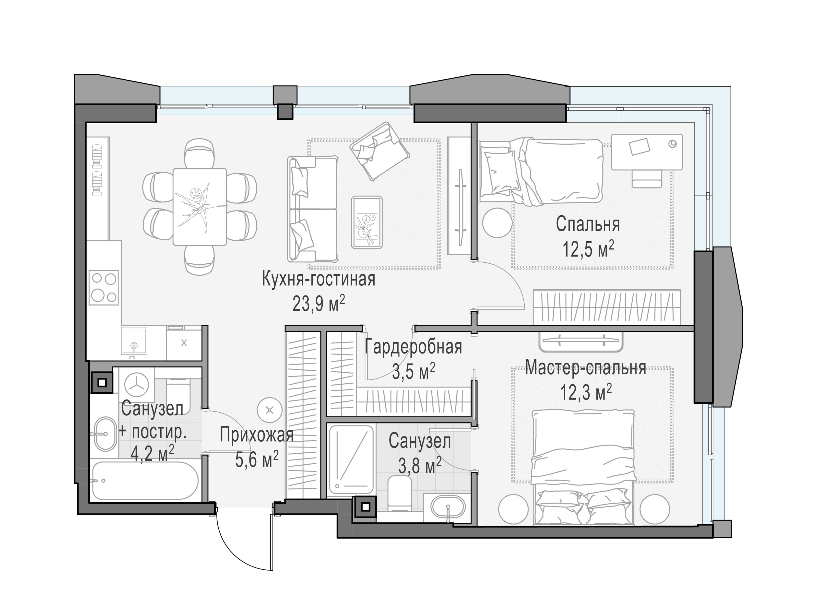 - Мастер-зона с гардеробной. Просторное место для отдыха и удобного хранения вещей.