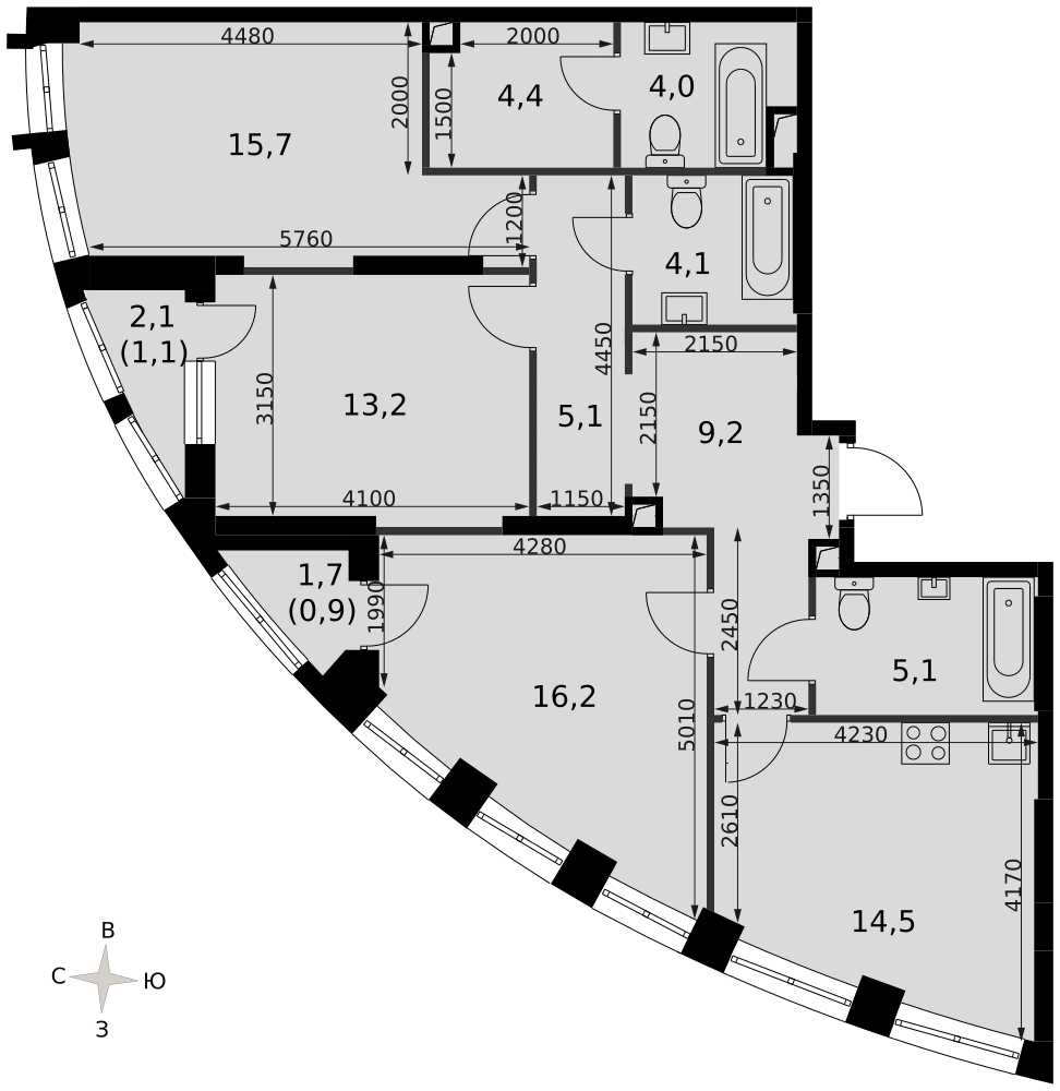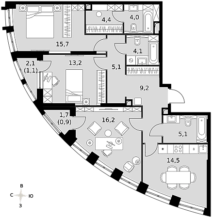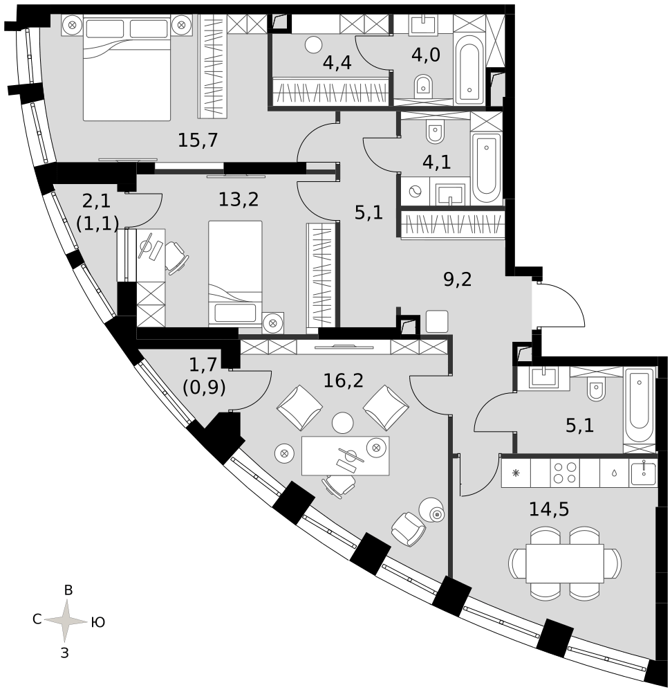 - Мастер-зона с санузлом и гардеробной. Всё для вашего комфорта и удобства, включая личный санузел и гардероб.
