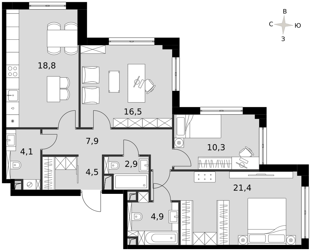 Продаётся 3-к квартира номер 493 общей площадью 91.2 кв.м. на 34-м этаже 44 этажного здания. Без отделки. Цена с учётом скидки.