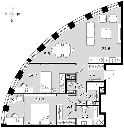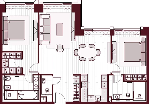 - Мастер-зона с санузлом и гардеробной. Всё для вашего комфорта и удобства, включая личный санузел и гардероб.