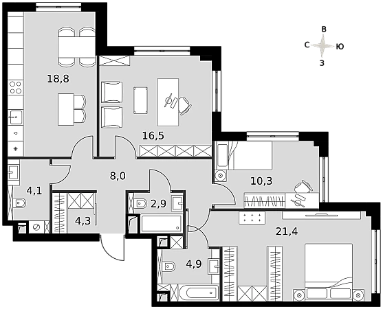 - Мастер-зона с санузлом. Уют и комфорт в одном пространстве.