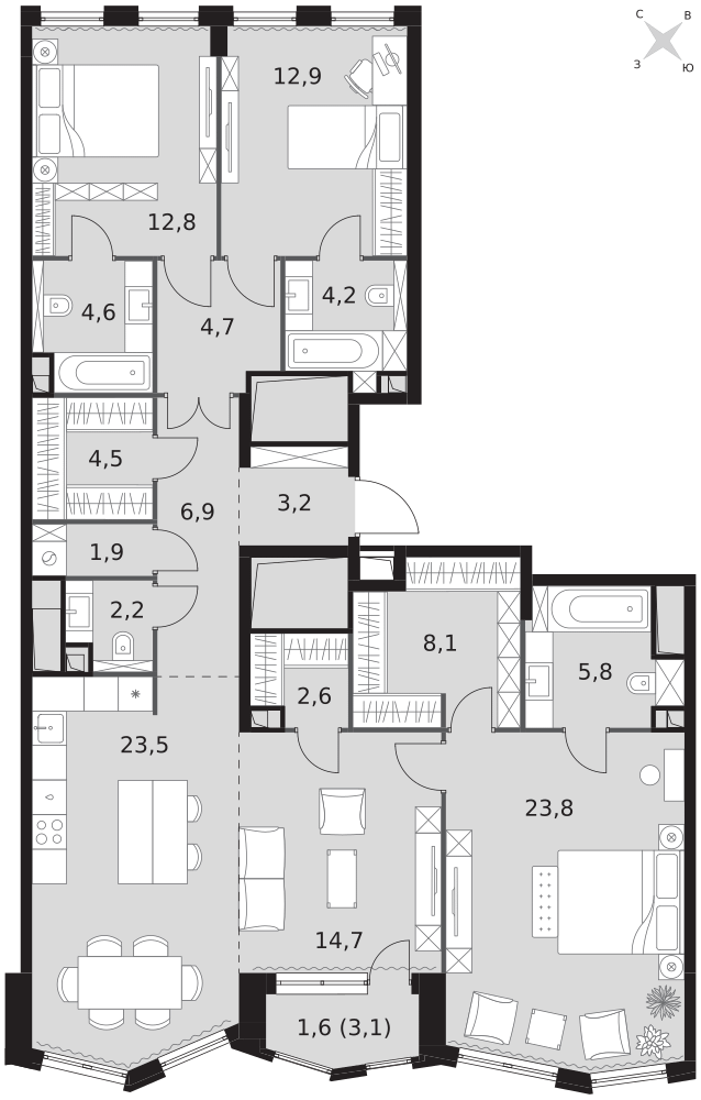 - Мастер-зона с санузлом и гардеробной. Всё для вашего комфорта и удобства, включая личный санузел и гардероб.