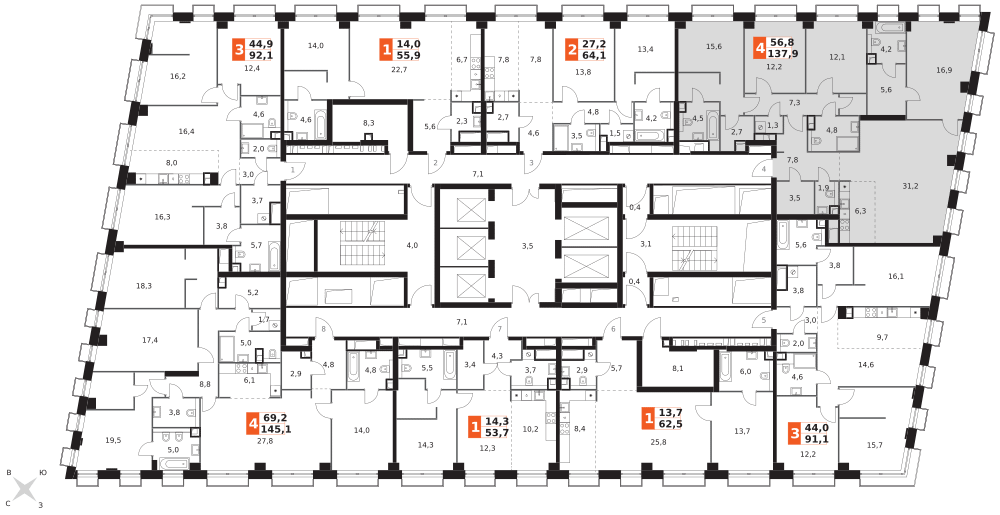 Продаётся 5-к квартира номер 568 общей площадью 137.9 кв.м. на 29-м этаже 43 этажного здания. Без отделки. Цена с учётом скидки.