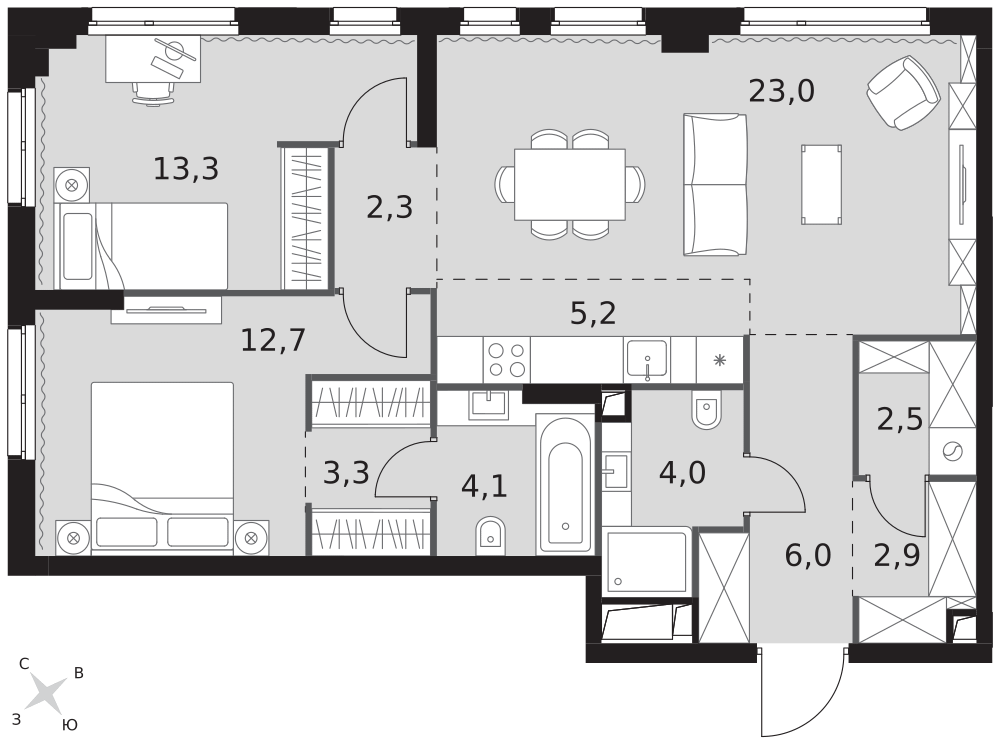 - Мастер-зона с санузлом и гардеробной. Всё для вашего комфорта и удобства, включая личный санузел и гардероб.
