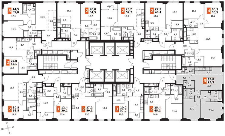 Продаётся 3-к квартира номер 766 общей площадью 73.9 кв.м. на 28-м этаже 42 этажного здания. Без отделки. Цена с учётом скидки.