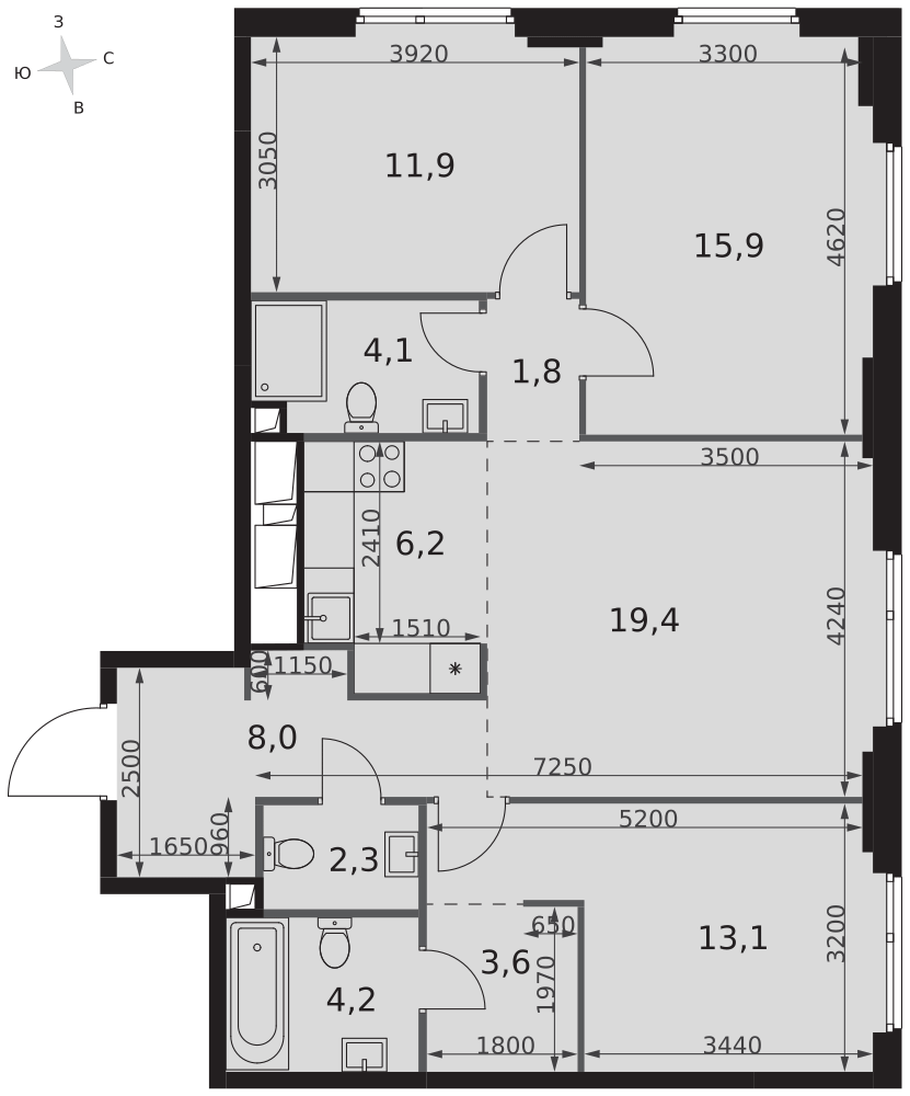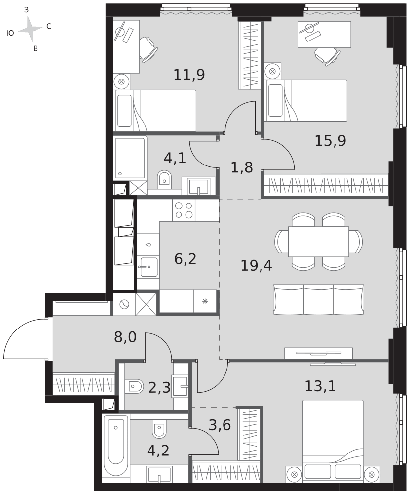 - Мастер-зона с санузлом и гардеробной. Всё для вашего комфорта и удобства, включая личный санузел и гардероб.