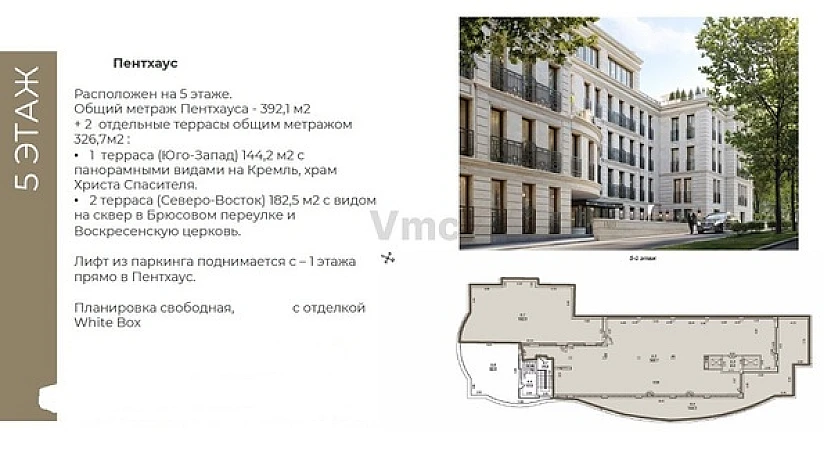 Апартаменты - Пентхаус на весть этаж , Расположен на 5 этаже. Общий метраж Пентхауса - 392,1 м2 + 2 отдельные террасы общим метражом 326,7м2 :