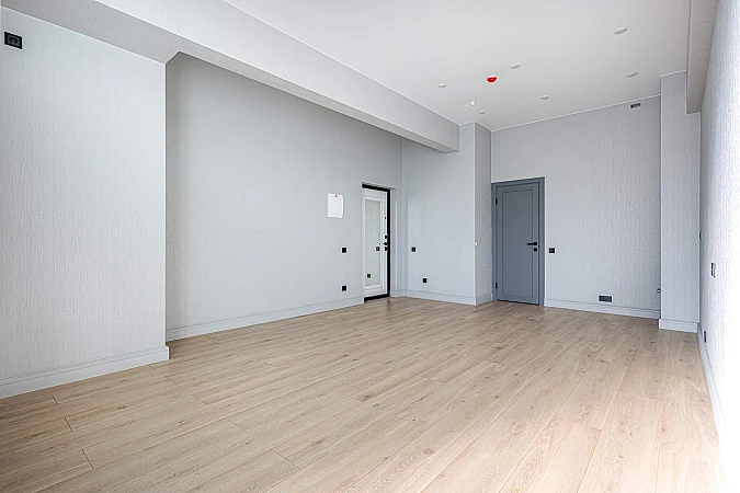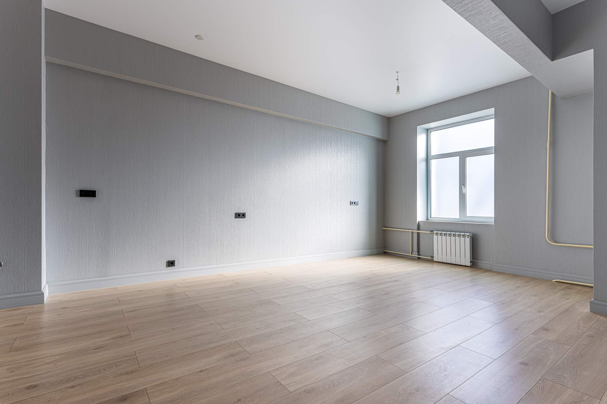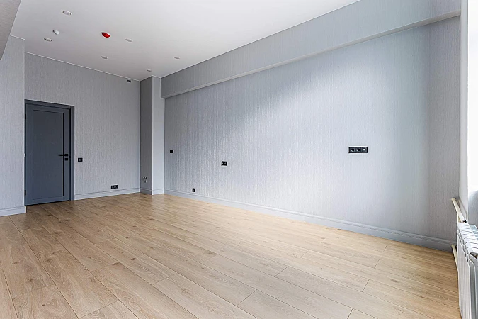 На полу постелен ламинат, на стенах поклеены светлые обои.