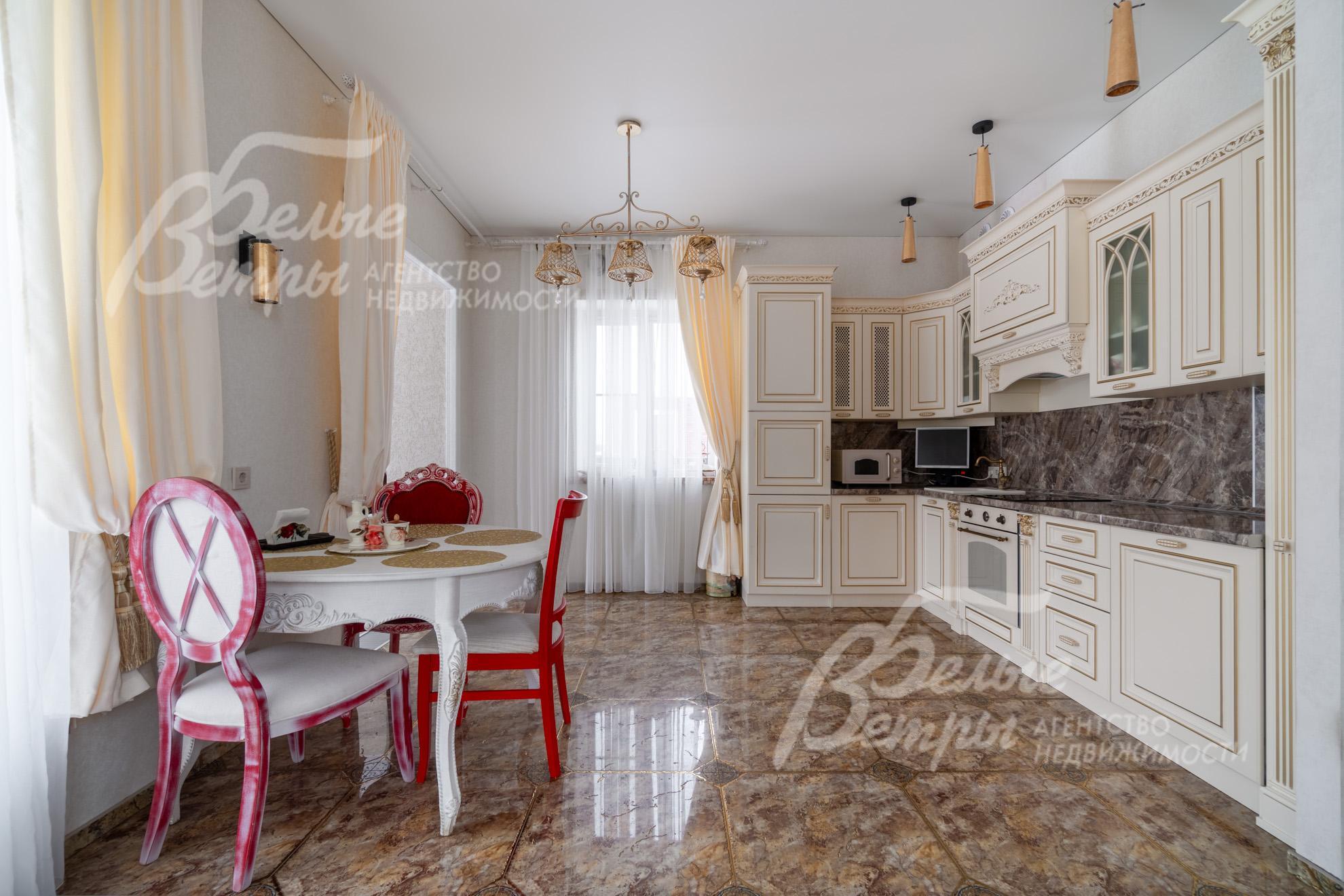 Мебель, оборудование: дом полностью меблирован и укомплектован бытовой техникой. На кухне установлен отечественный кухонный гарнитур в стиле «Прованс»: фасады выполнены из МДФ, столешница — из искусственного камня. Столовая зона оборудована гарнитуром белорусского производства. В жилых помещениях размещена деревянная мягкая мебель итальянского бренда Giorgio Casa. В спальнях установлены спальные гарнитуры той же марки. Санузлы оснащены сантехникой: гигиеническим и верхним душем Cezares Margot, смесителями Grohe, душевым гарнитуром Ideal Standard.