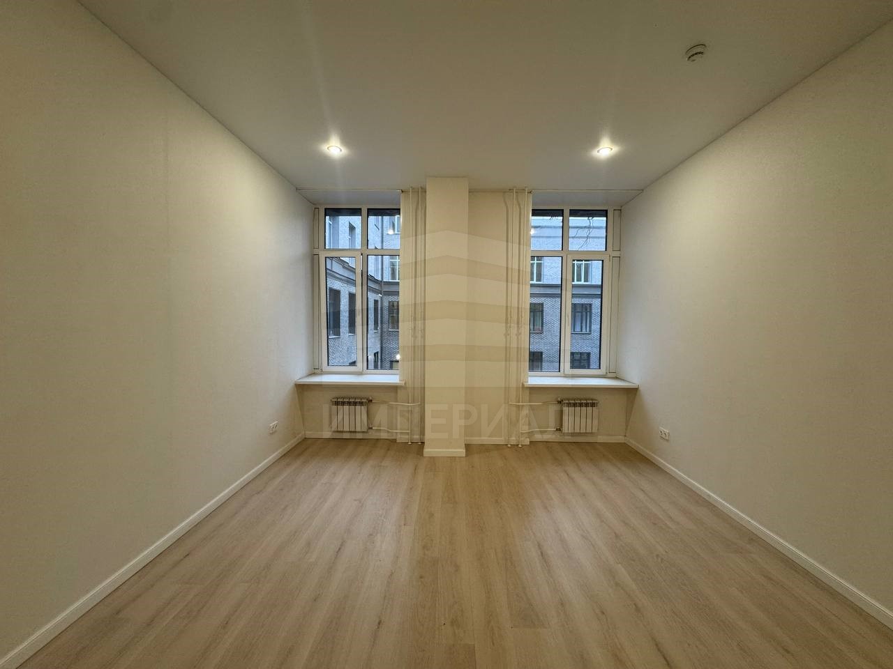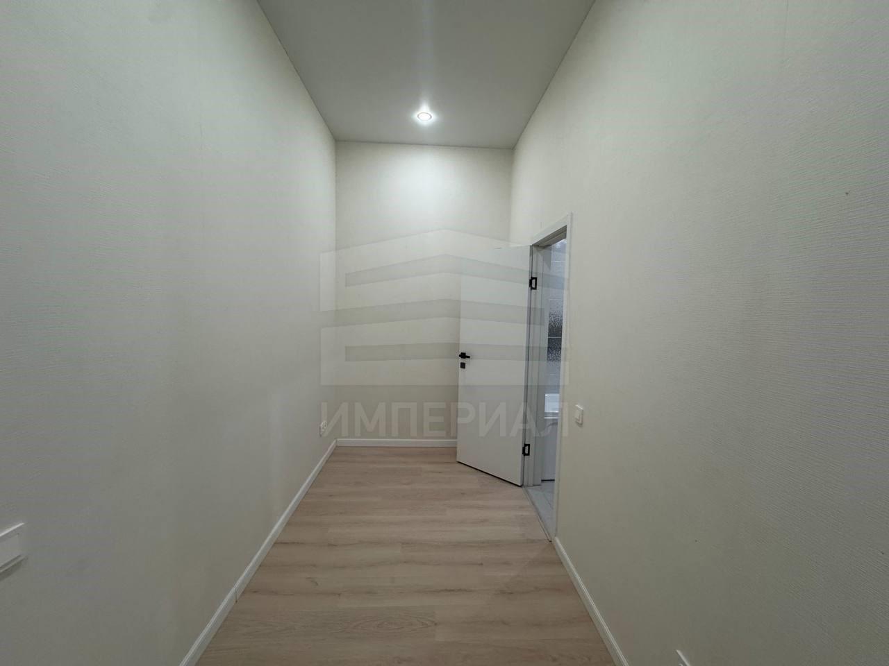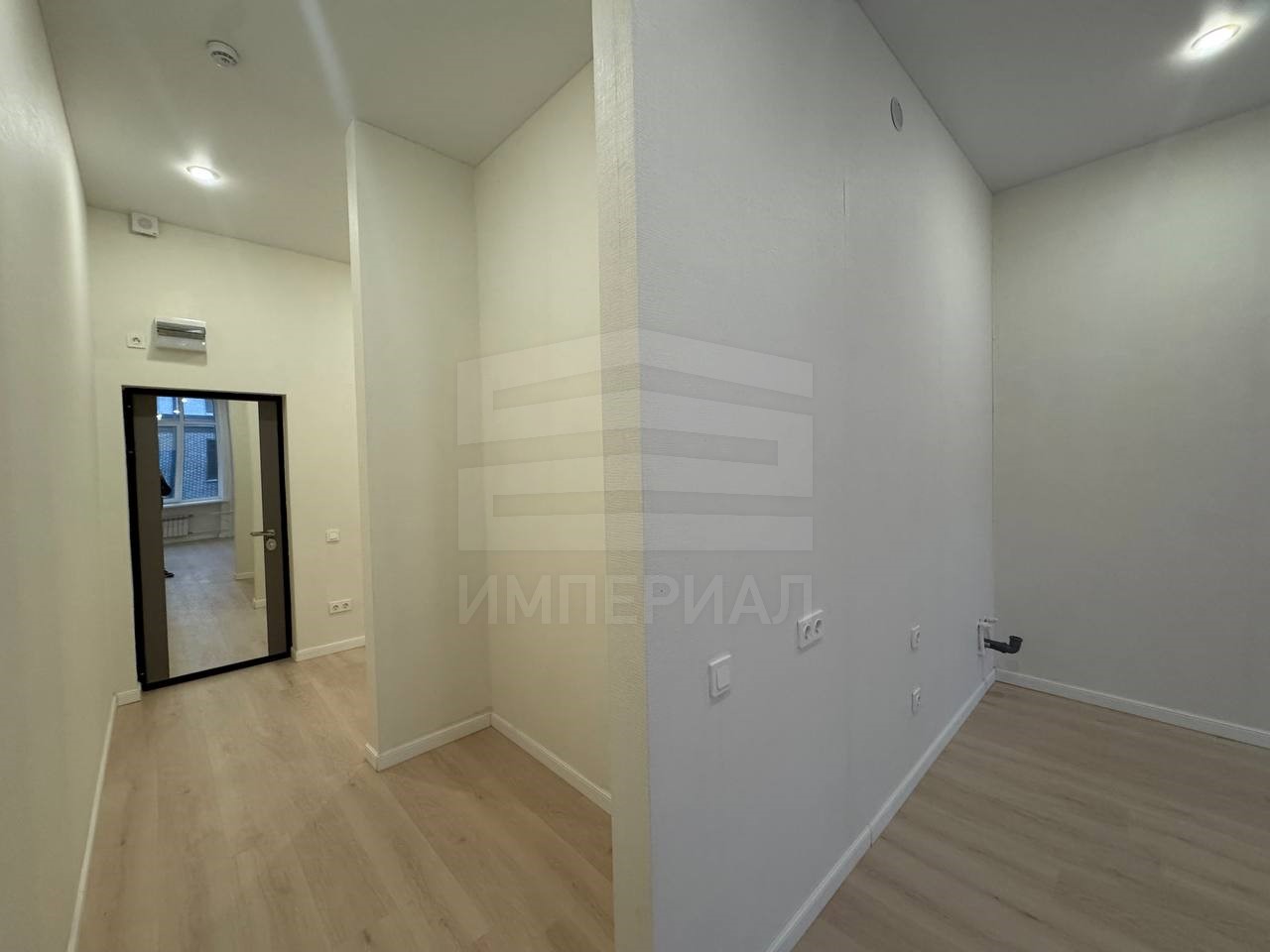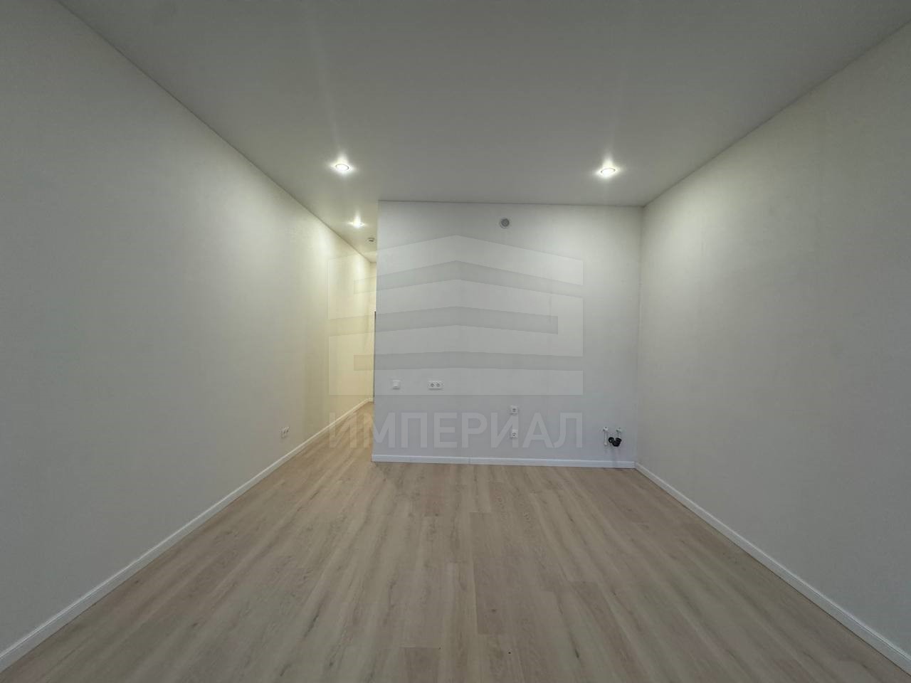 На стенах поклеены обои под покраску, на полу постелен ламинат с плинтусами и откосами. Есть вытяжная вентиляция в санузле и на кухне, выходы хв/гв, место под раковину на кухне. Кроме того, в помещениях уже есть выключатели освещения, розетки для бытовой техники и роутера, а также сделаны закладные для оптоволокна для интернета.