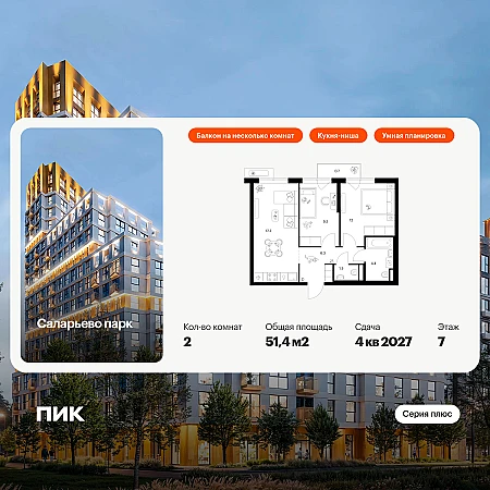 Купить 2к квартиру 51 м² в ЖК Саларьево парк