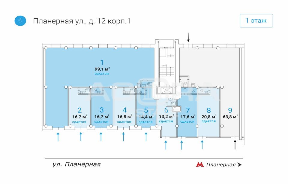 Площадь помещения - 99,1м2 (на плане блок № 1), первый этаж, два отдельных входа: один с первой линии Планерной улицы и второй со двора, большие витрины, высокие потолки - 3,7 метров, место для размещения рекламной вывески. Прекрасная видимость и доступность помещения. Подходит под размещение: минимаркета, магазина, кафе, магазина, салона красоты. Район сложившейся плотной жилой застройки, высокий пешеходный трафик. Рядом находится транспортно -пересадочный узел "Планерная". Городская парковка. Объект № 549968Номер объекта: #5/549968/310