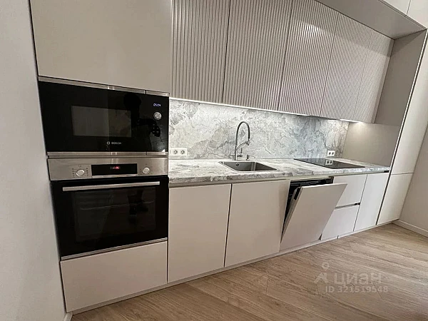 Кухня сделана на заказ, фасады из эмали, удобный остров с выдвижными ящиками, фурнитура Blum, встроенная бытовая техника BOSCH (индукционная варочная панель, духовой шкаф, СВЧ, Gorenje (посудомоечная машина, холодильник).