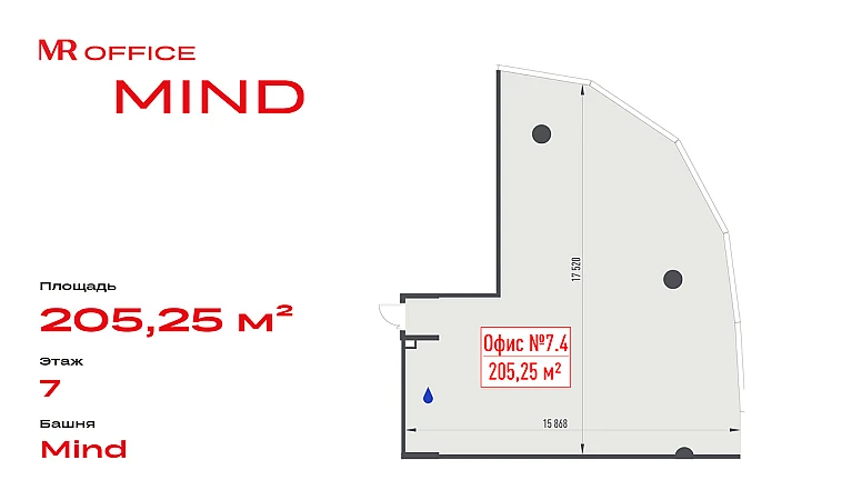 MIND — это 17-этажная офисное здание с современной архитектурой, панорамным остеклением и технологичной инженерией. Помещения предполагают возможность индивидуального зонирования пространства под задачи вашей команды.