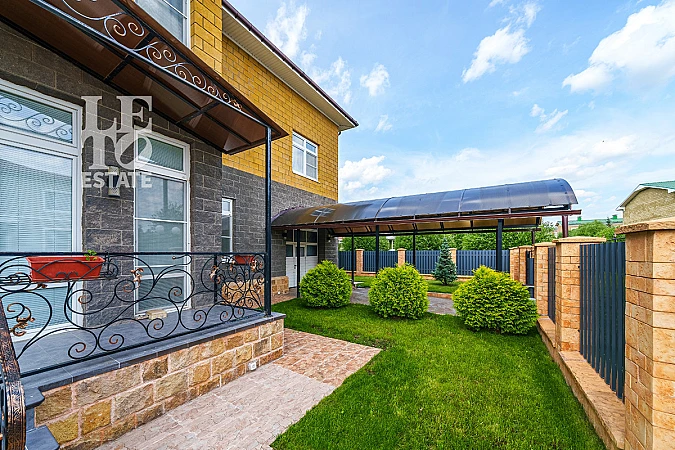 На прекрасном ровном участке высажены декоративные и плодовые деревья, кустарники, цветы. Функция автополива позволяет отлучаться из дома на долгий срок и не беспокоиться о сохранности растений. Перед въездом в гараж организован навес. Также перед домом предусмотрена гостевая парковка - позволяет разместить до трех машин.