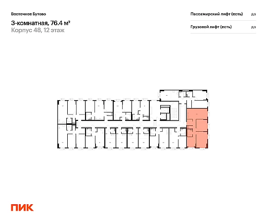 Продаётся 3-комн.квартира площадью 76.40 кв.м на 12 этаже 17 этажного дома (Корпус 48, секция 2) проекта ПИК Восточное Бутово. Светлый просторный подъезд на уровне земли, функциональная планировка, большие окна, с отделкой.