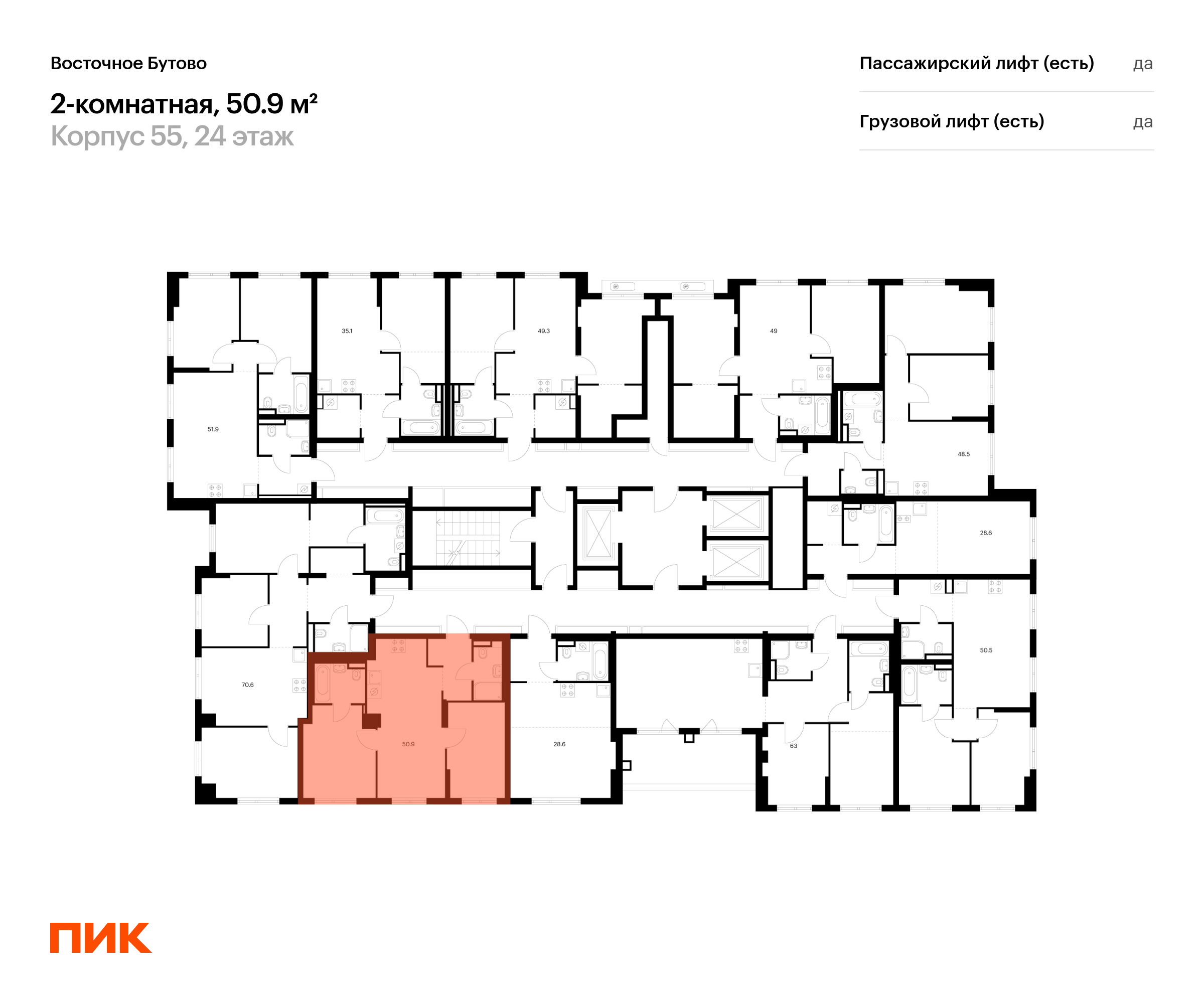 Продаётся 2-комн.квартира площадью 50.90 кв.м на 24 этаже 25 этажного дома (Корпус 55, секция 1) проекта ПИК Восточное Бутово. Светлый просторный подъезд на уровне земли, функциональная планировка, большие окна, с отделкой.