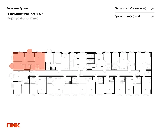 Продаётся 3-комн.квартира площадью 68.90 кв.м на 3 этаже 25 этажного дома (Корпус 48, секция 4) проекта ПИК Восточное Бутово. Светлый просторный подъезд на уровне земли, функциональная планировка, большие окна, с отделкой.