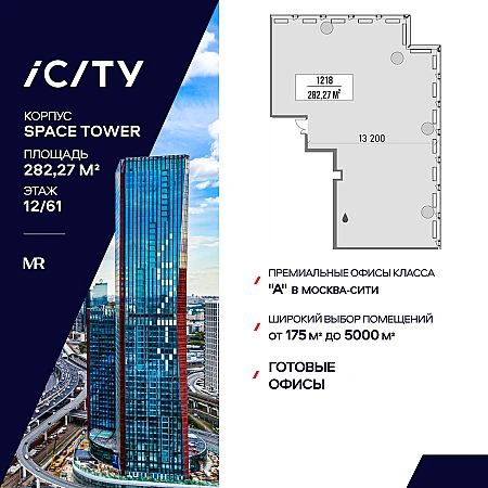 Предлагается офисное помещение, с рассрочкой 0%, площадью 282.27 м2 на 12 этаже в башне ""Space Tower"" деловых небоскребов класса ""А"" iCITY. Расположен в Москва-Сити. Проектом предусмотрена уникальная система проветривания помещений. Свободная планировка. Отделка Shell and Core. Высокие потолки 3,75 м и панорамное остекление обеспечивают отличную инсоляцию.