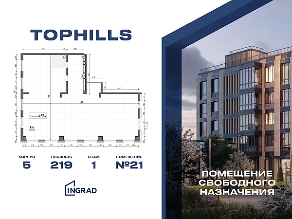 Действует беспроцентная рассрочка. Готовое торговое помещение площадью 219 кв.м. в квартале TopHills. Расположено на 1 этаже корпуса 5, имеет 2 полноценных входа и место под рекламную вывеску. Помещение без отделки с высотой потолка 5,1 метра. Предусмотрена электрическая мощность 65,5 кВт.
