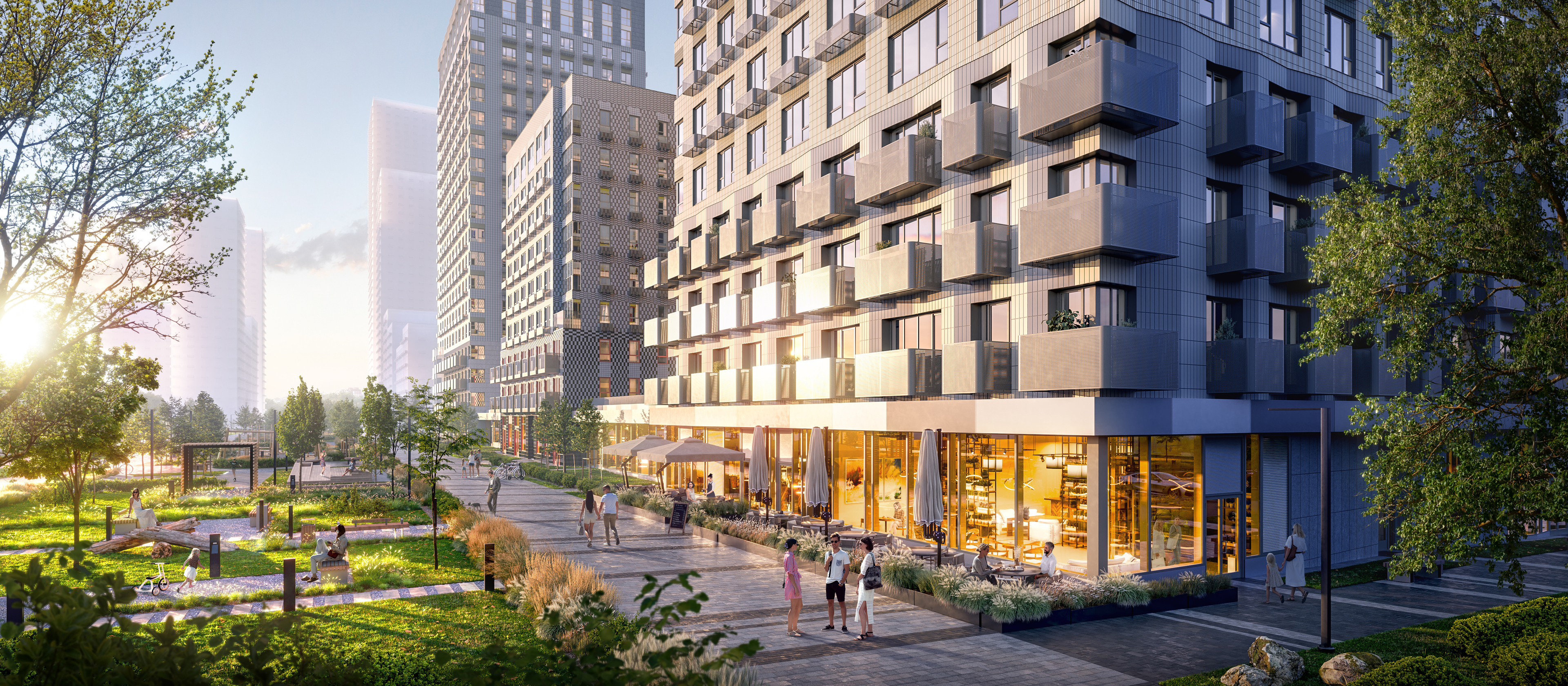 В проекте будет вся необходимая инфраструктура: детский сад на 350 малышей и школа на 950 мест. Через весь квартал протянется пешеходный бульвар для прогулок и отдыха на свежем воздухе. А на первых этажах домов откроются кафе, магазины, пункты выдачи маркетплейсов и другие полезные сервисы.