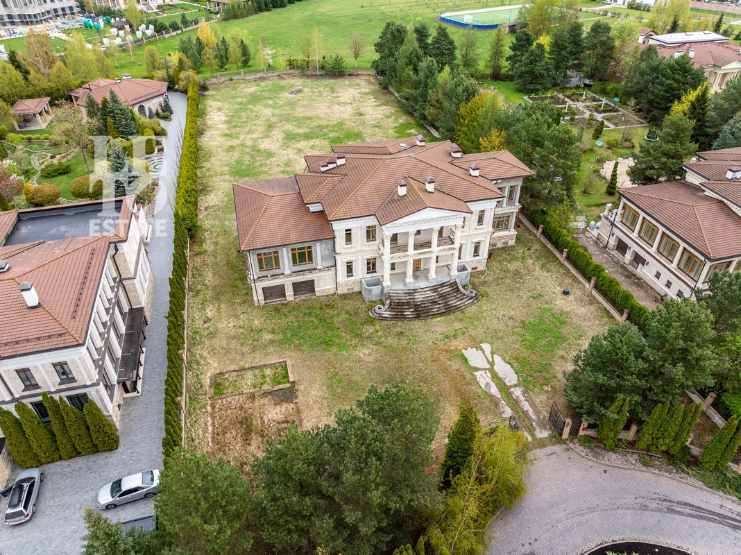 На земельном участке есть дом в классическом стиле. Фасад дома без отделки, внутри проведены работы по выравниванию стен, разведена электрическая проводка. Дом отапливается. Фундамент – монолитная плита, стены кирпичные, лестница монолитная. Цоколь сухой, вокруг дома сделан дренаж. Вода отводится в ливневую канализацию. Есть проектная и рабочая документации по внутренним строительным работам. Два соседа - слева и справа, живут постоянно.