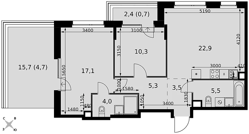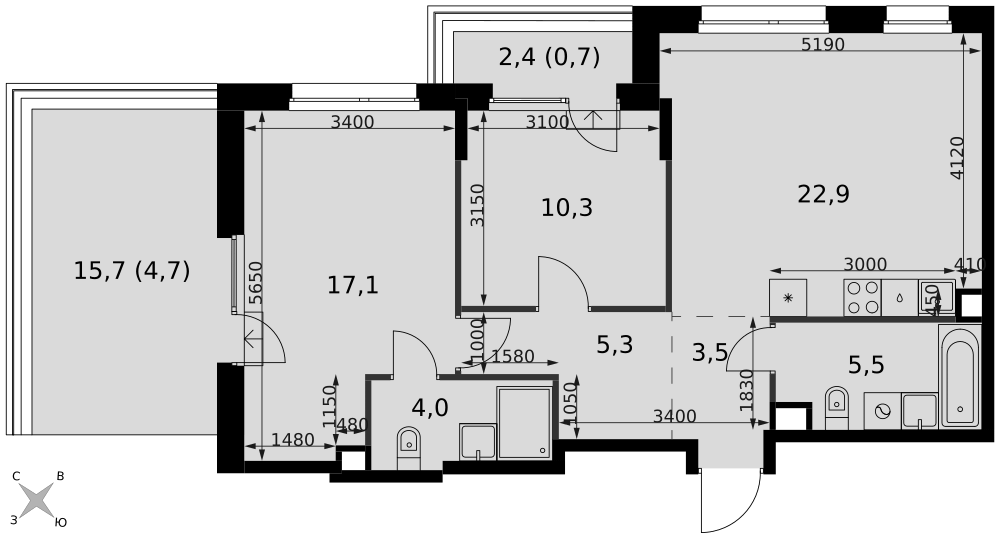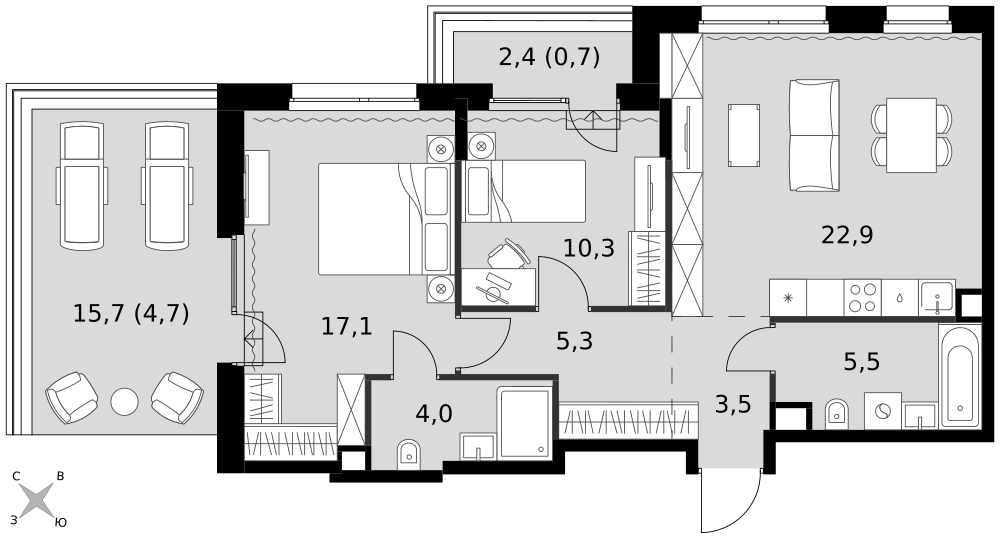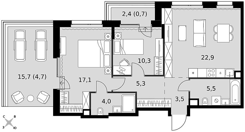 - Мастер-зона с санузлом и гардеробной. Всё для вашего комфорта и удобства, включая личный санузел и гардероб.