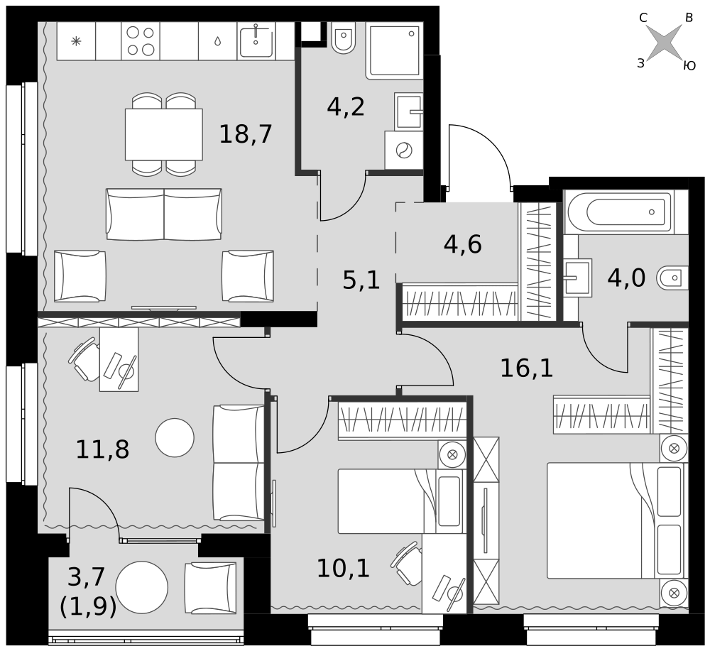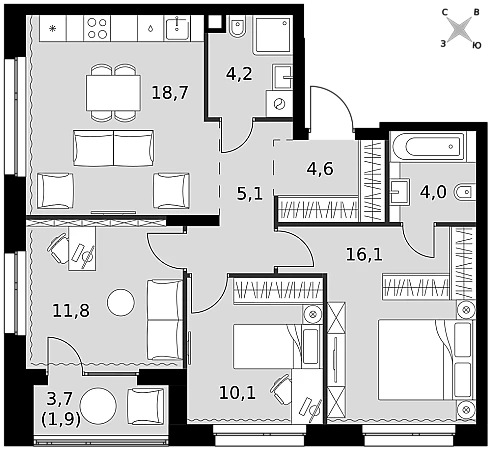 - Мастер-зона с санузлом и гардеробной. Всё для вашего комфорта и удобства, включая личный санузел и гардероб.