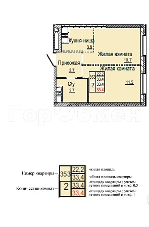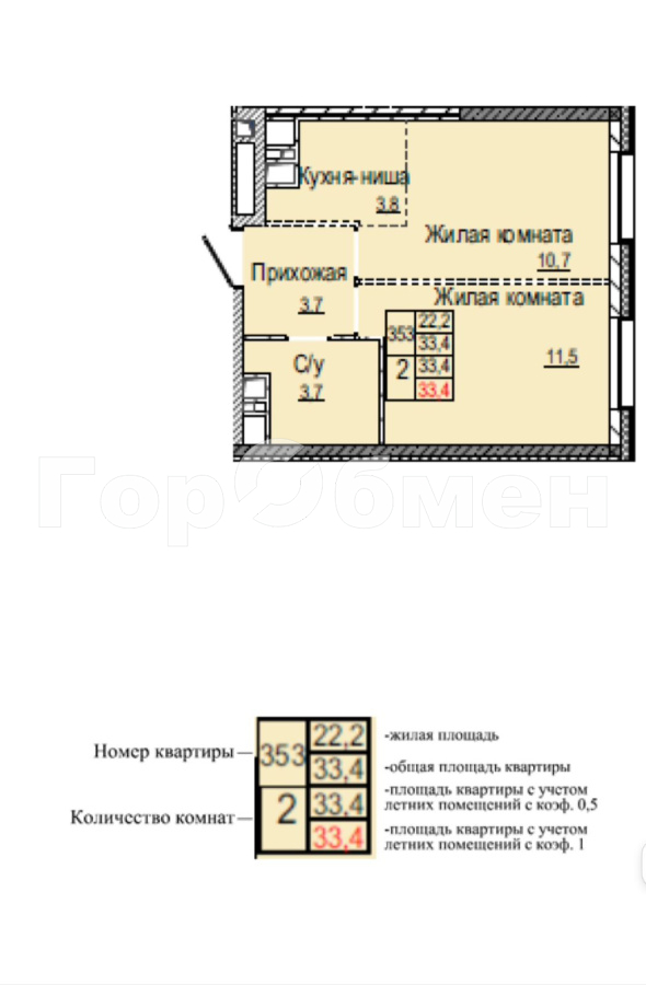 - Общая площадь — 33,4 м²