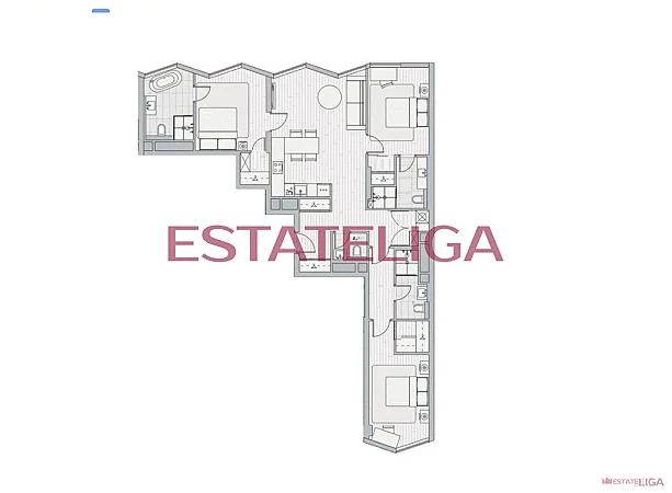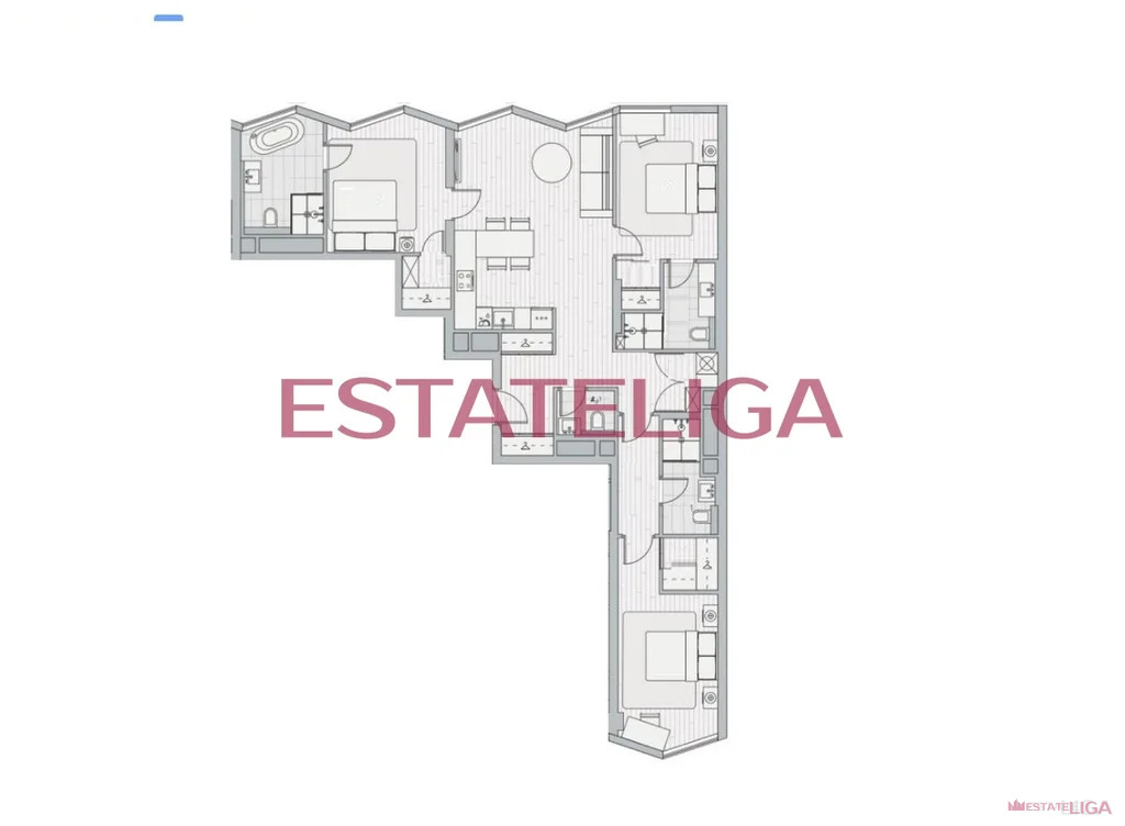 Функциональная планировка квартиры в формате евро-4: большая кухня-гостиная, 3 мастер-спальни, каждая со своим санузлом и гардеробной, гостевой санузел и просторный холл.