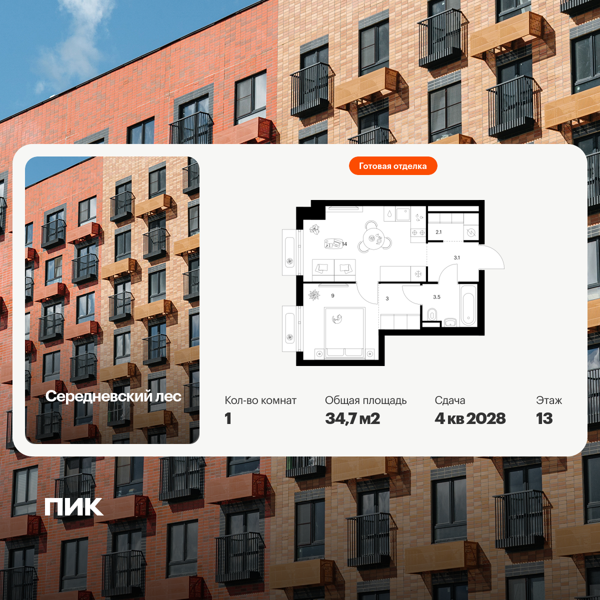 Продаётся 1-комн.квартира площадью 37.09 кв.м на 9 этаже 9 этажного дома (Корпус 4.1, секция 5) проекта ПИК Ильинские луга. Светлый просторный подъезд на уровне земли, функциональная планировка, большие окна, с отделкой.