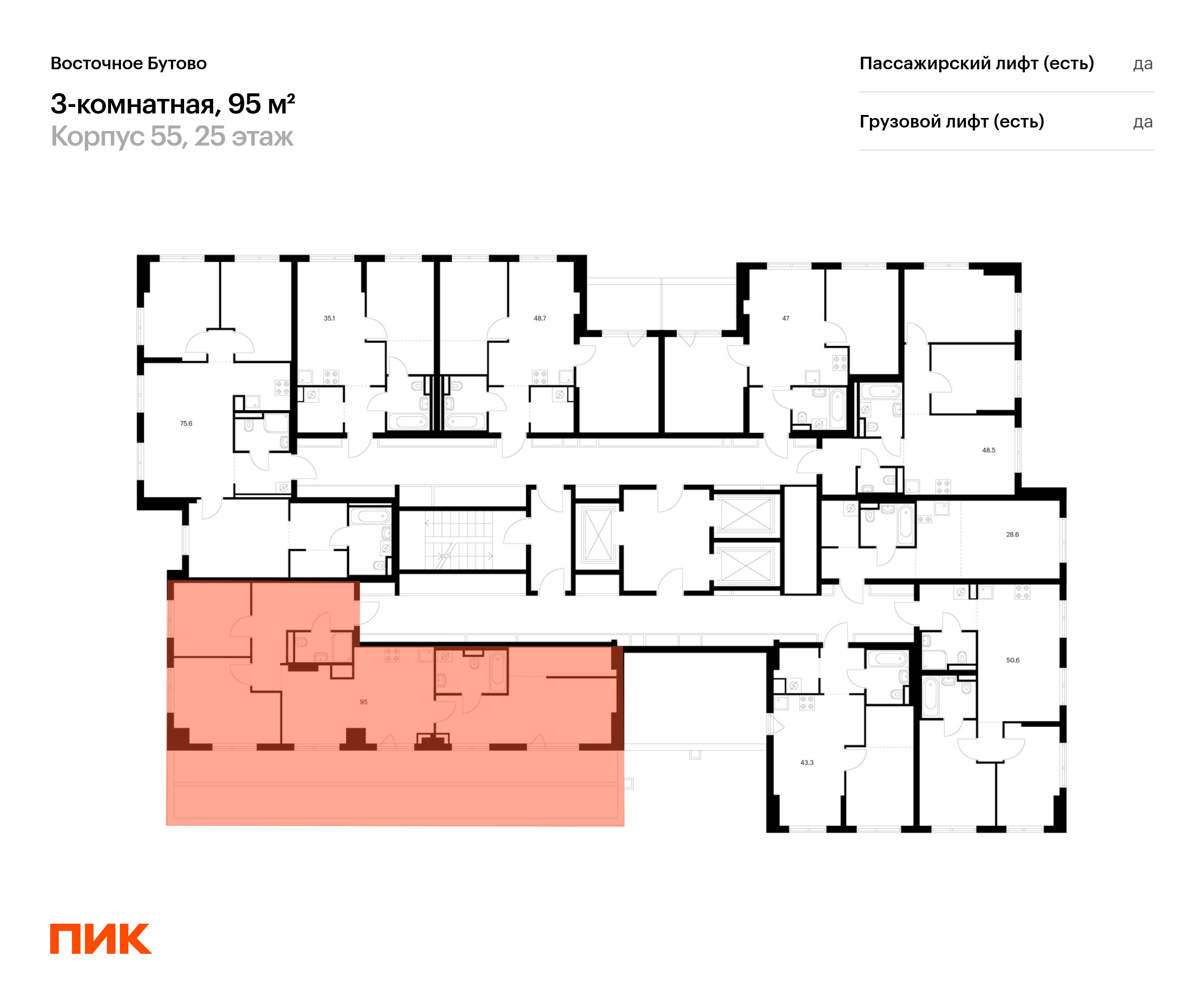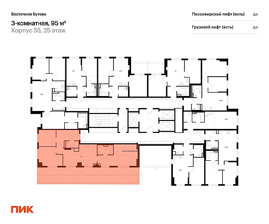Продаётся 3-комн.квартира площадью 95.00 кв.м на 25 этаже 25 этажного дома (Корпус 55, секция 1) проекта ПИК Восточное Бутово. Светлый просторный подъезд на уровне земли, функциональная планировка, большие окна, с отделкой.