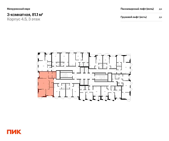 Продаётся 3-комн.квартира площадью 81.10 кв.м на 3 этаже 32 этажного дома (Корпус 4.5, секция 2) проекта ПИК Мичуринский парк. Светлый просторный подъезд на уровне земли, функциональная планировка, большие окна, с отделкой.