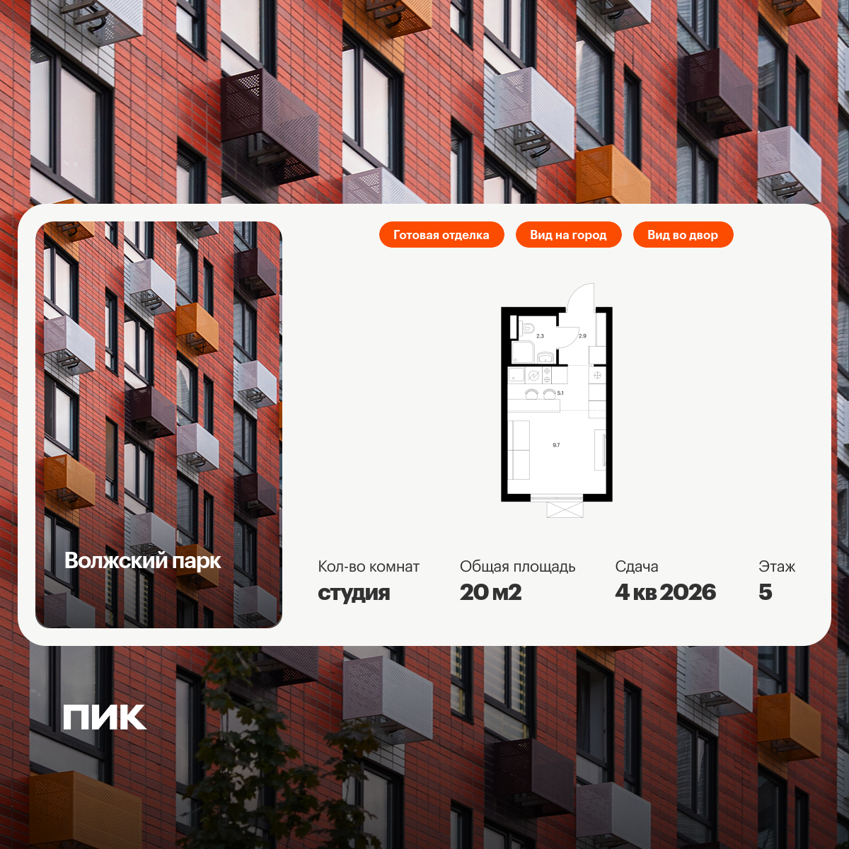 Продаётся квартира-студия площадью 20.00 кв.м на 5 этаже 15 этажного дома (Корпус 6.2, секция 3) проекта ПИК Волжский парк. Светлый просторный подъезд на уровне земли, функциональная планировка, большие окна, с отделкой.