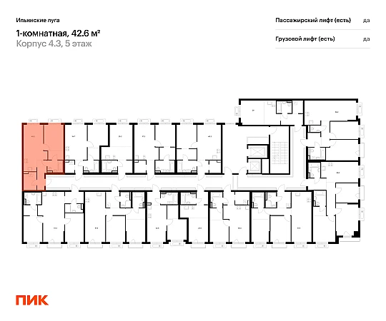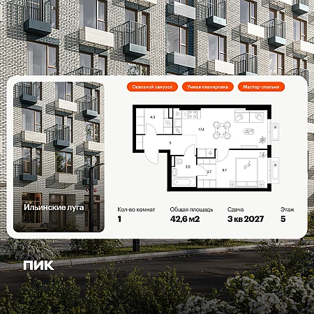 Продаётся 1-комн.квартира площадью 42.60 кв.м на 5 этаже 9 этажного дома (Корпус 4.3, секция 4) проекта ПИК Ильинские луга. Светлый просторный подъезд на уровне земли, функциональная планировка, большие окна, с отделкой.