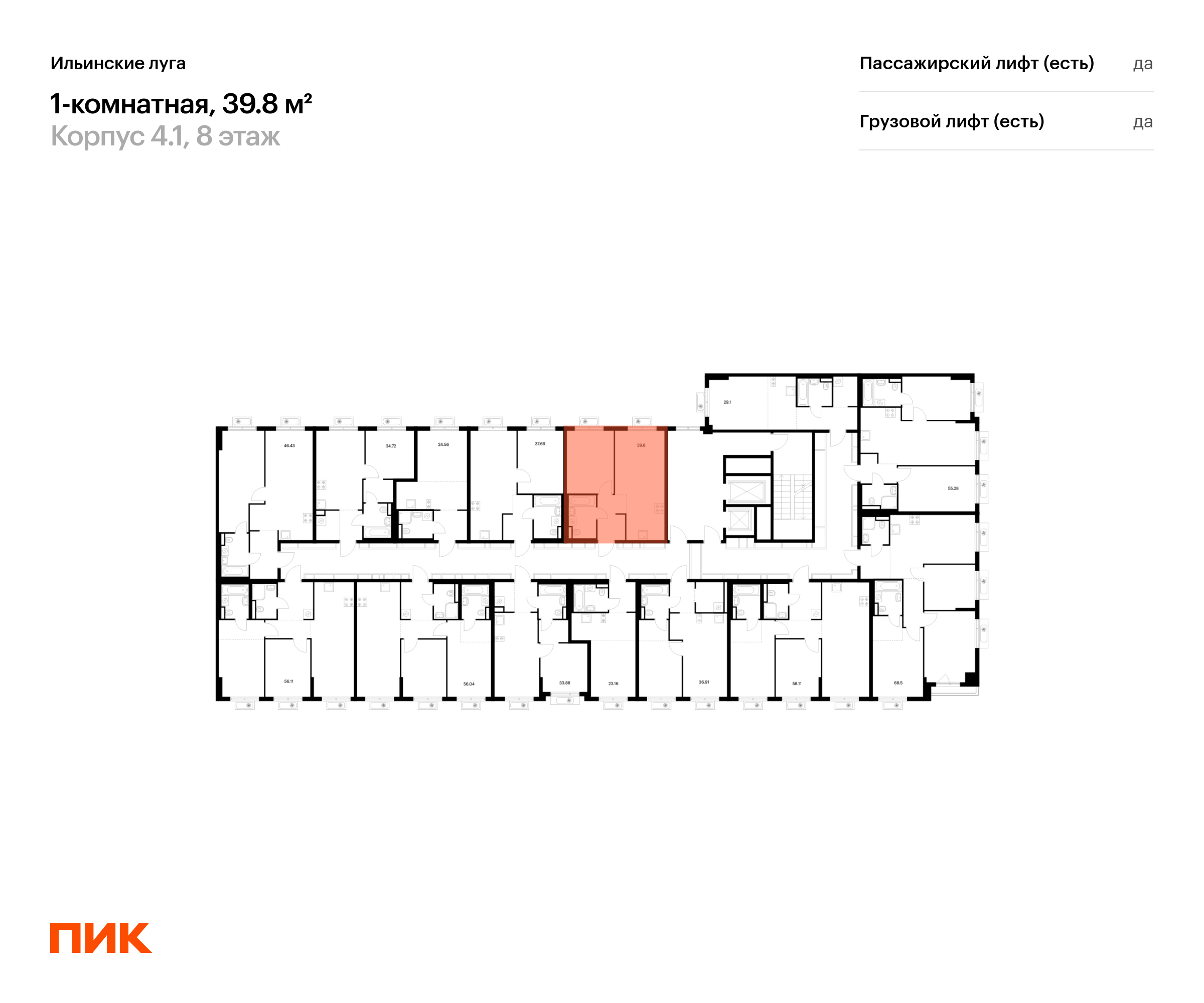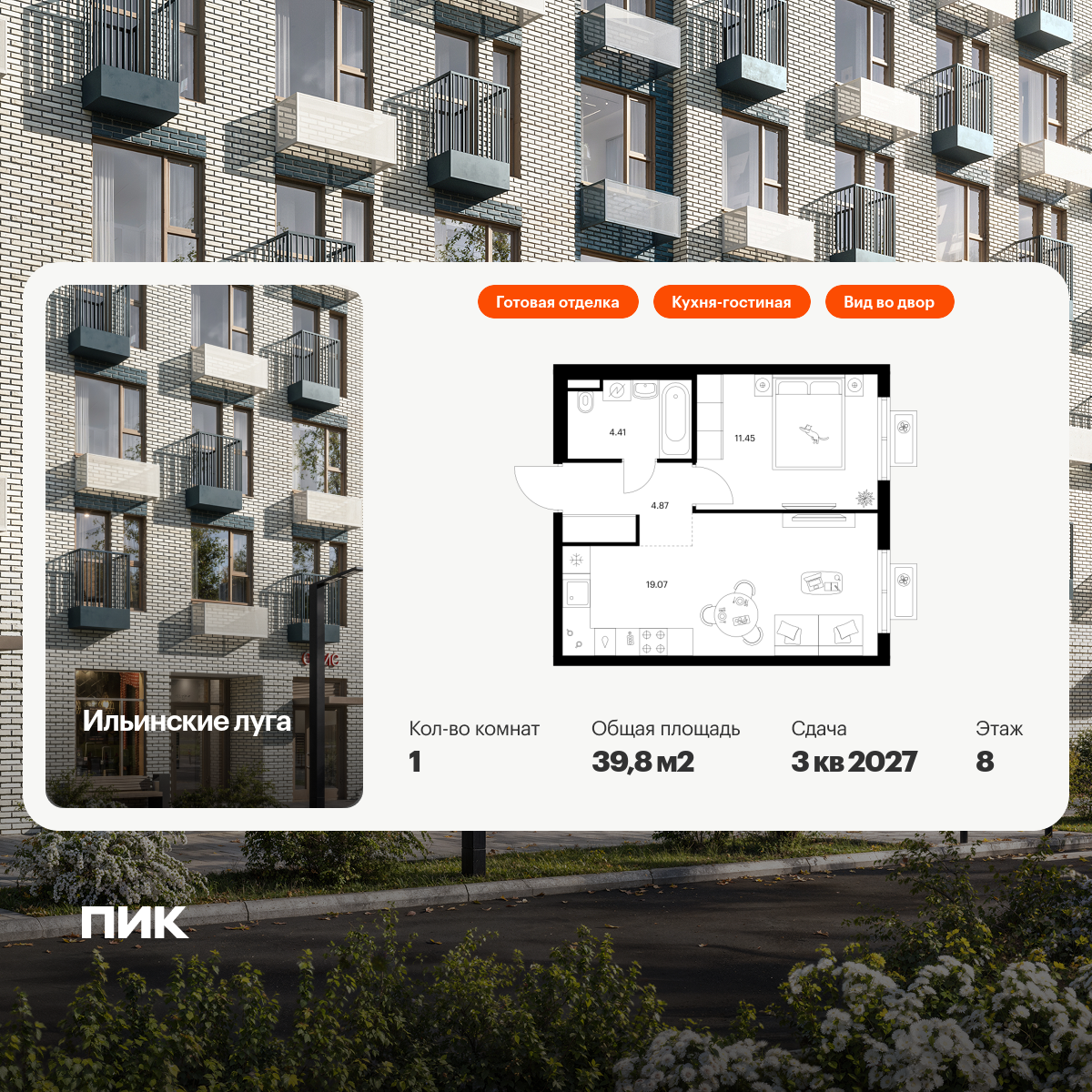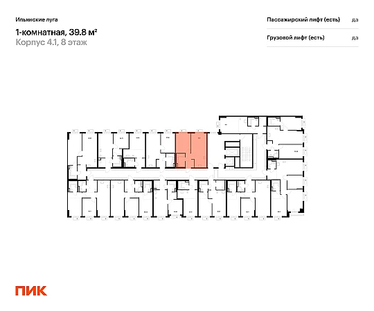 Продаётся 1-комн.квартира площадью 39.80 кв.м на 8 этаже 9 этажного дома (Корпус 4.1, секция 4) проекта ПИК Ильинские луга. Светлый просторный подъезд на уровне земли, функциональная планировка, большие окна, с отделкой.