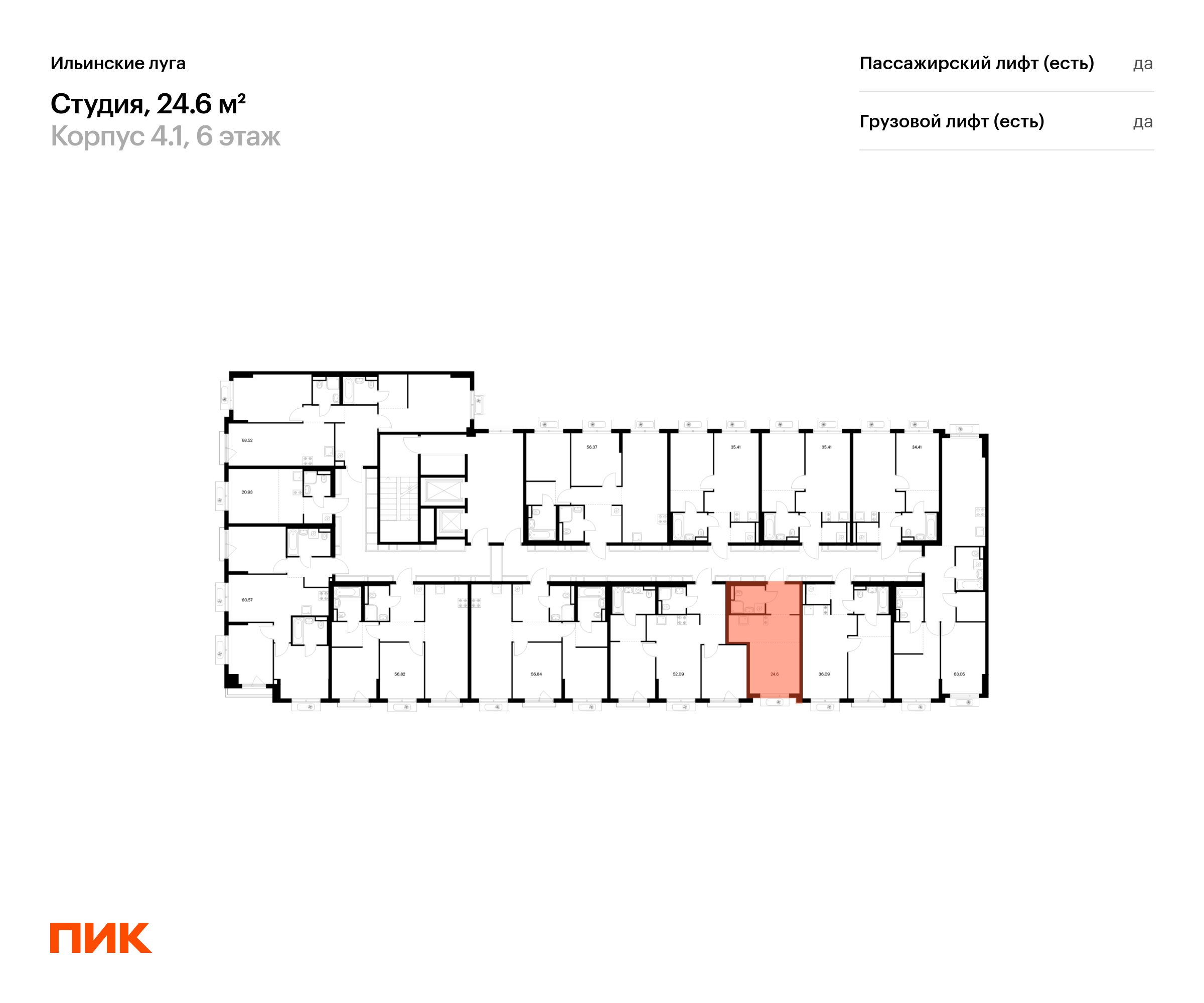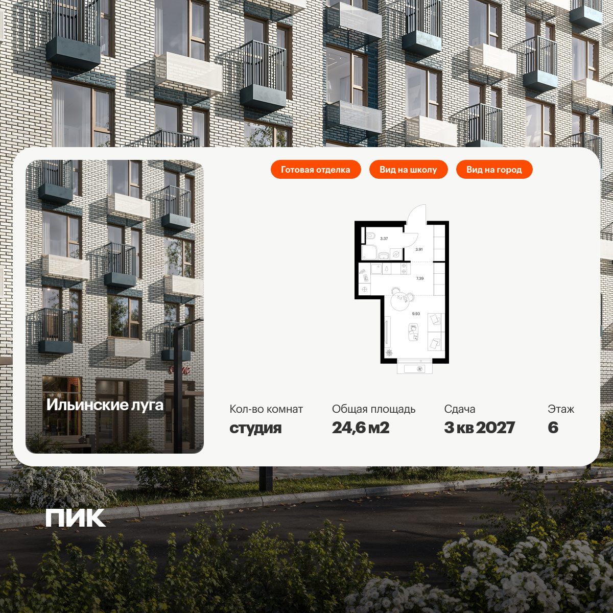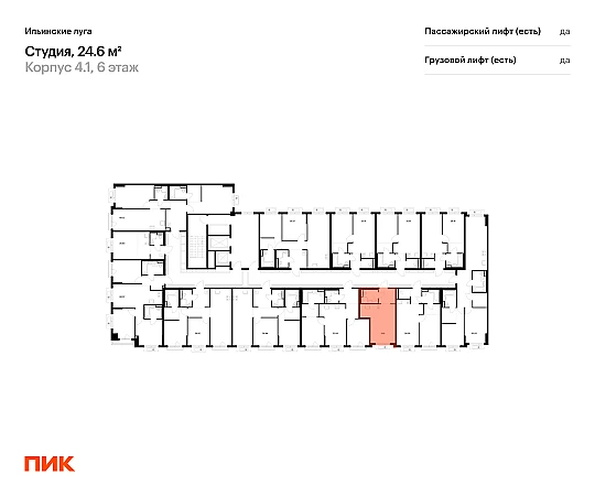 Продаётся квартира-студия площадью 24.60 кв.м на 6 этаже 9 этажного дома (Корпус 4.1, секция 5) проекта ПИК Ильинские луга. Светлый просторный подъезд на уровне земли, функциональная планировка, большие окна, с отделкой.