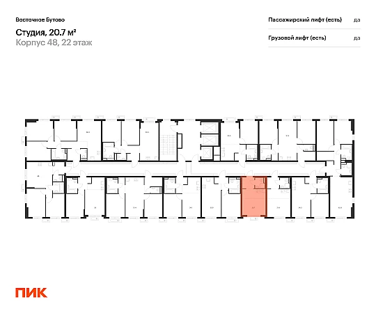 Продаётся квартира-студия площадью 20.70 кв.м на 22 этаже 25 этажного дома (Корпус 48, секция 4) проекта ПИК Восточное Бутово. Светлый просторный подъезд на уровне земли, функциональная планировка, большие окна, с отделкой.