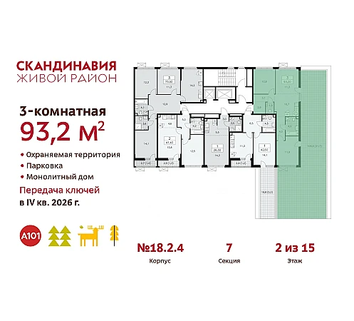 Дом монолитный, двухподъездный, переменной этажности, от 9 до 15 этажей. Квартира находится во 2-й секции высотой 15 этажей в корпусе 2.18.2.4. На этаже 5 квартир. В подъезде 1 пассажирский и 1 грузовой лифт. Начало строительства - 1 квартал 2024 года. Окончание строительства - 4 квартал 2026 года. Оформление сделки по договору долевого участия.