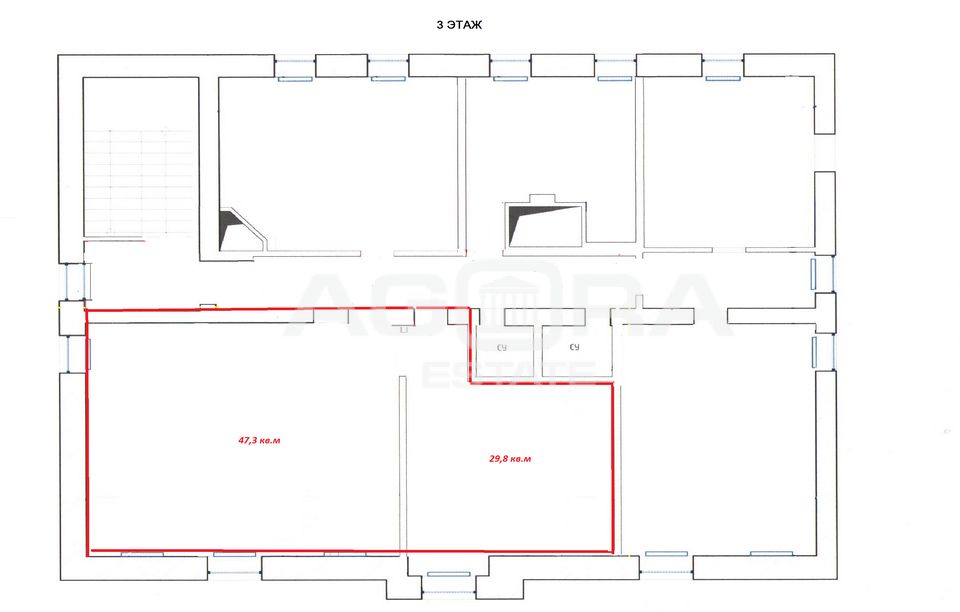 Площадь 77,1 м2 3-й этаж в 3-х этажном бизнес-центре: два смежных кабинета - 47,3 м2 и 29,8 м2. С ремонтом, готовы к въезду.