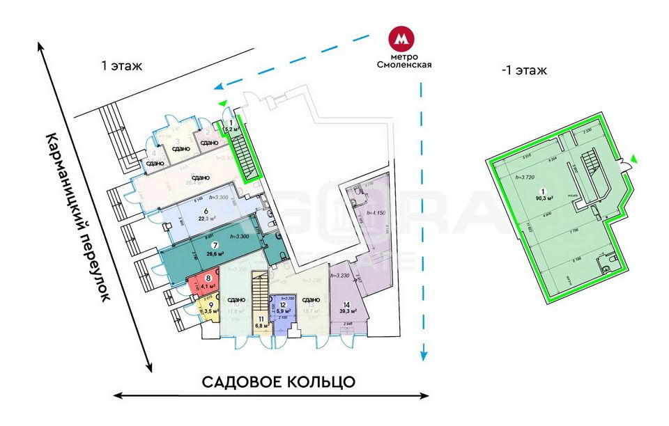 Площадь 95,5 м2. подвал с отдельным входом на 1-м этаже со стороны Садового кольца (на плане блок № 1) , нежилое здание. Планировка открытая, потолки 3м.