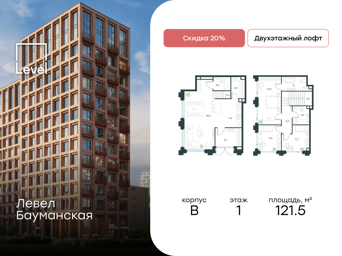 Купить ПСН 121 м² в ЖК Левел Бауманская