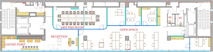 Целый этаж 363 м²: 4 кабинета, open space, переговорная комната, ресепшен, большая кухня, зона отдыха, гардеробная.