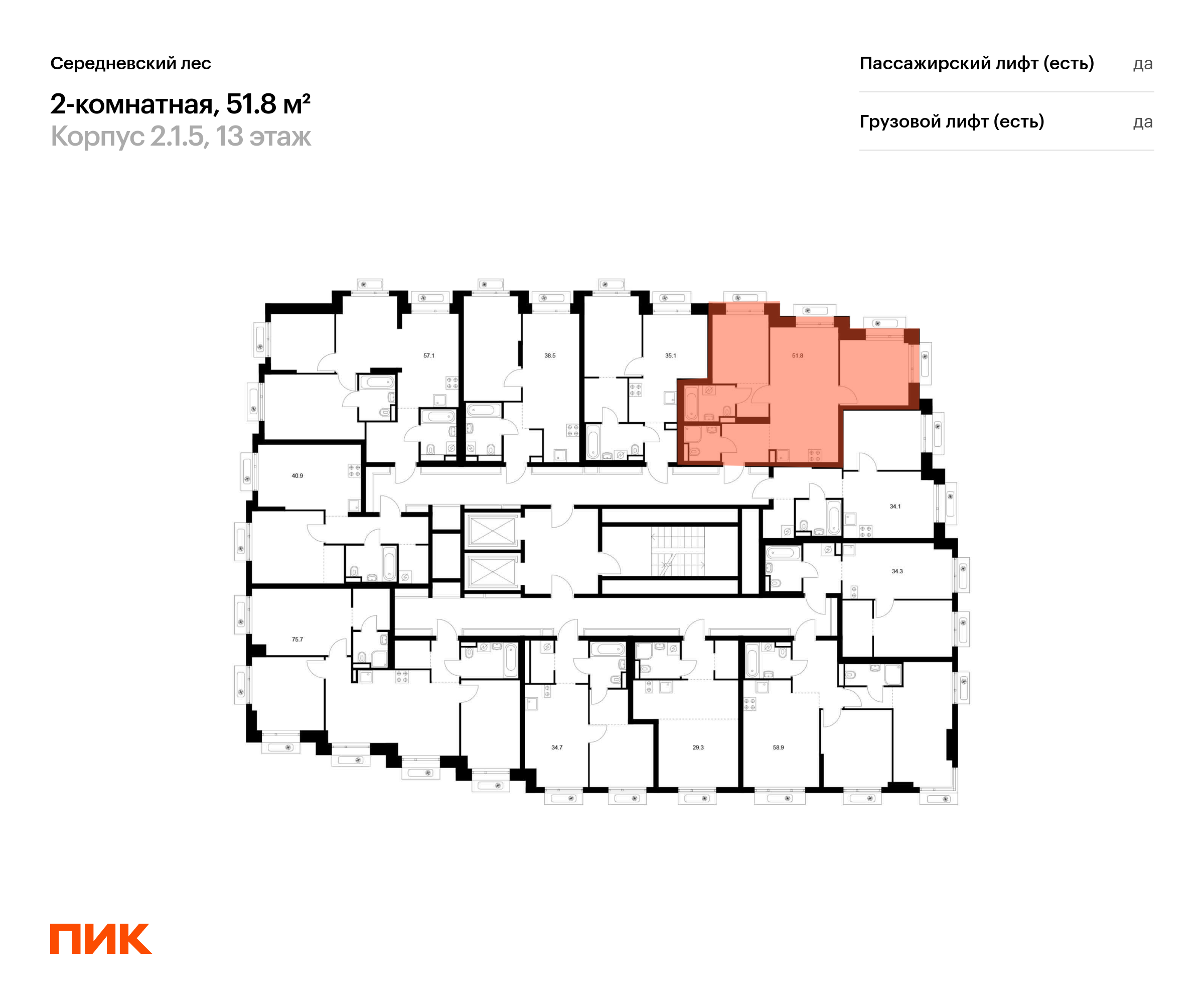 Продаётся 2-комн.квартира площадью 51.80 кв.м на 13 этаже 16 этажного дома (Корпус 2.1.5, секция 5) проекта ПИК Середневский лес. Светлый просторный подъезд на уровне земли, функциональная планировка, большие окна, с отделкой.