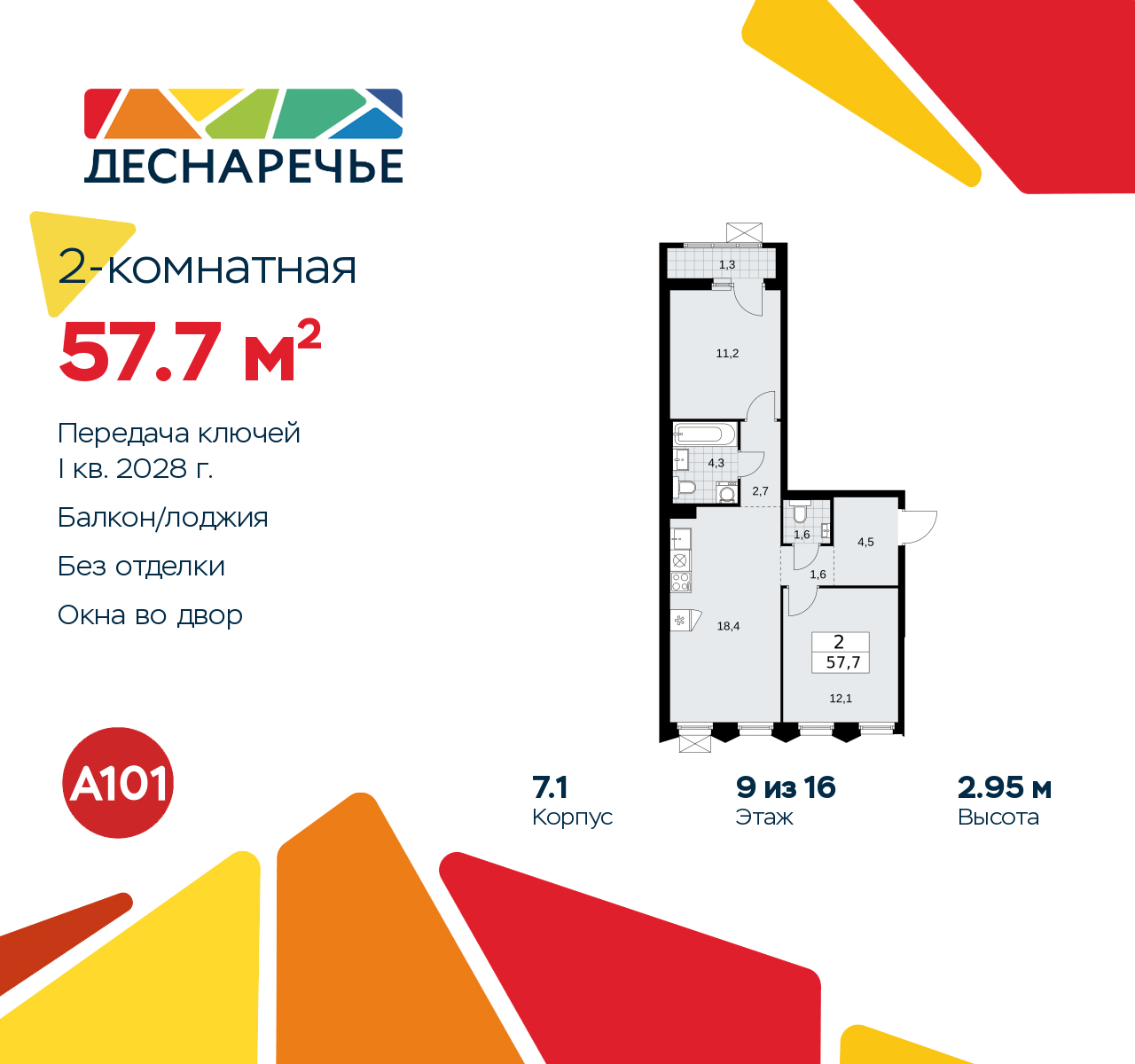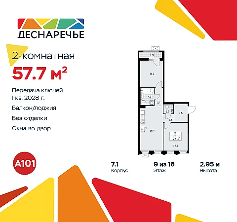 2-комн. квартира в ЖК "Деснаречье" на 9 этаже. Квартира без отделки, полностью готова к ремонту. Общая площадь: 57.7 кв.м., жилая: 23.3 кв.м., площадь просторной кухни-столовой: 18.4 кв.м. Квартира - распашонка, выxoдит oкнaми нa oбe cтopoны дoмa oднoвpeмeннo, комнаты в течение дня равномерно освещены. В квартире одна лоджия, один совмещенный и один раздельный санузел. Высота потолков 2.95 м.