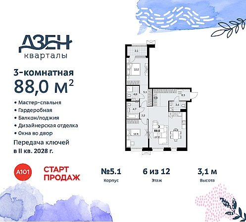 Купить 3к квартиру 88 м² в ЖК Дзен-кварталы