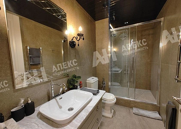 При отделке помещения использованы материалы премиального качества, в том числе оникс, установлена итальянская сантехника.